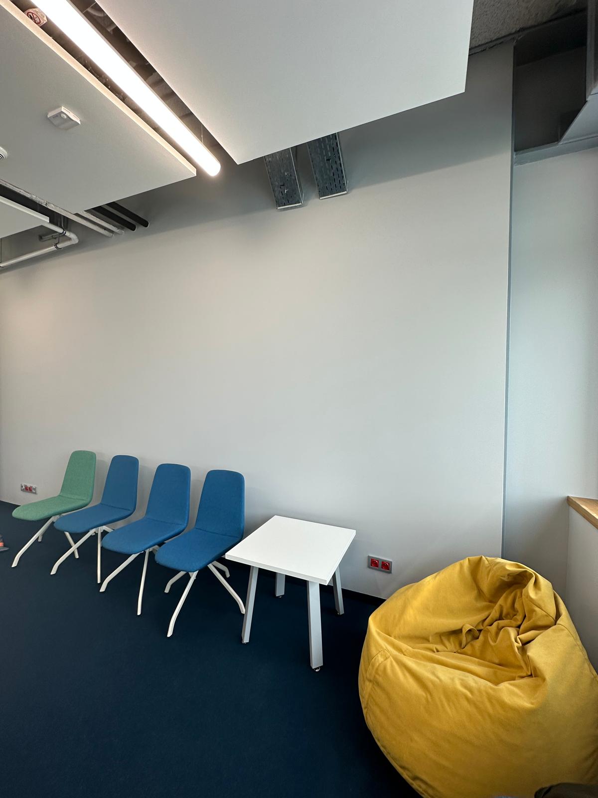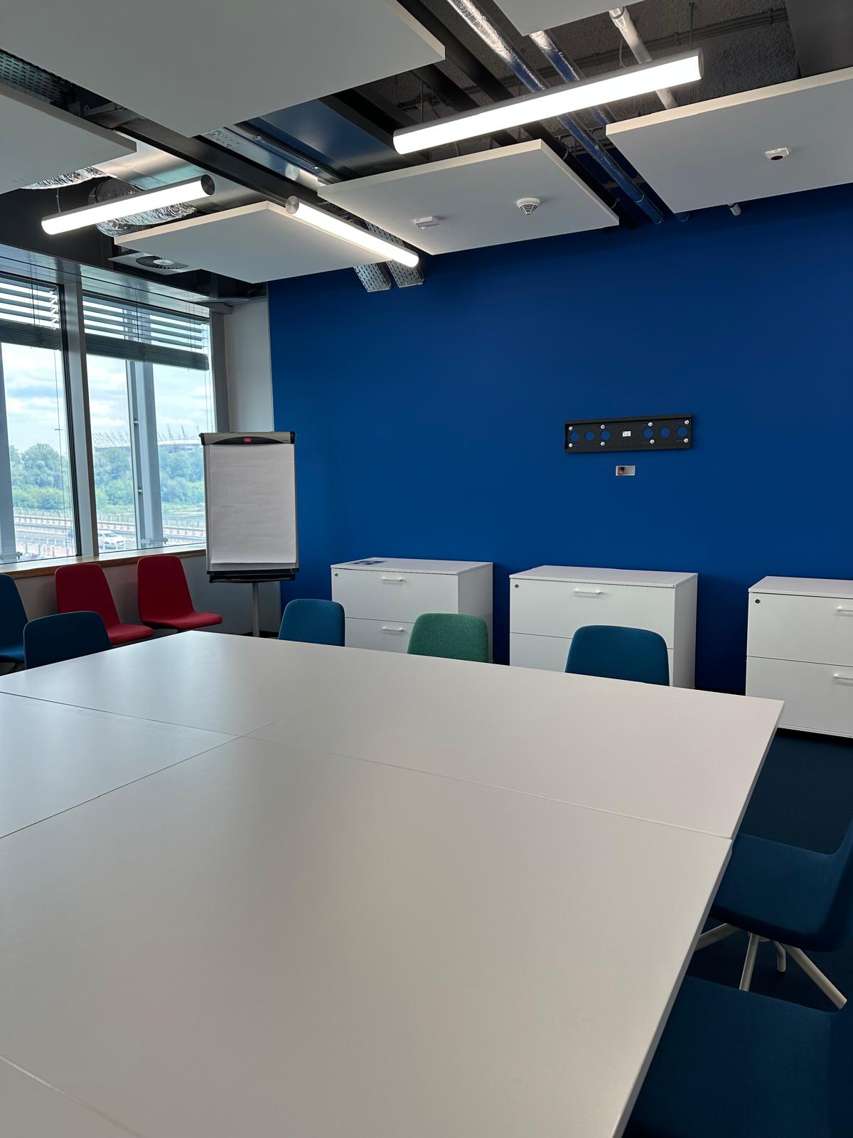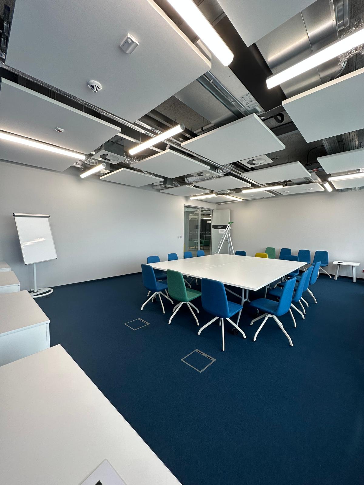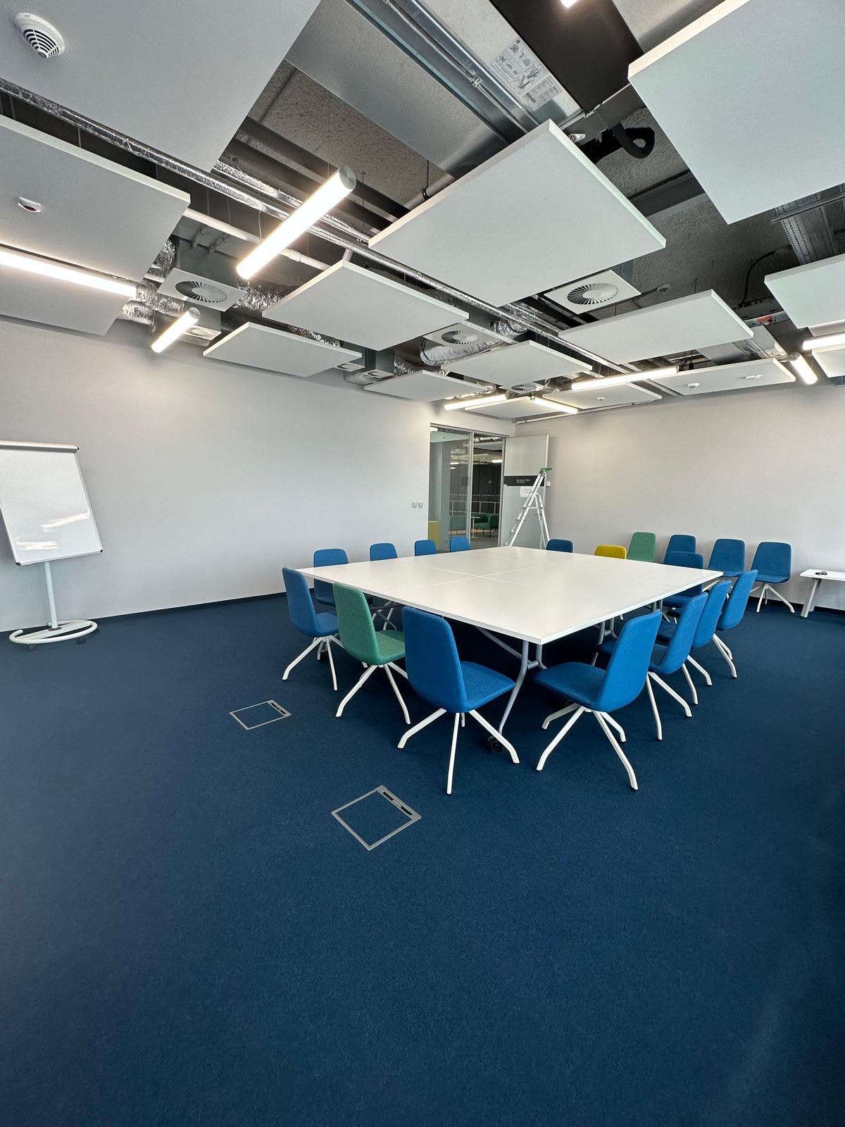 W trakcie prac zauważyliśmy, że cokoły przypodłogowe, wykonane przez poprzednią ekipę, nie spełniały standardów jakościowych. W ramach naszego partnerskiego podejścia, wykraczając poza ustalenia przetargowe, poświęciliśmy dodatkowy czas na ich naprawę. Nie mogliśmy pozwolić, by taki detal obniżył finalny efekt naszej pracy. Po zakończeniu wszystkich działań, sala konferencyjna została przez nas gruntownie wysprzątana. Na etapie odbioru klient z pełnym zadowoleniem potwierdził najwyższą jakość wykonanych prac, nie zgłaszając żadnych zastrzeżeń.