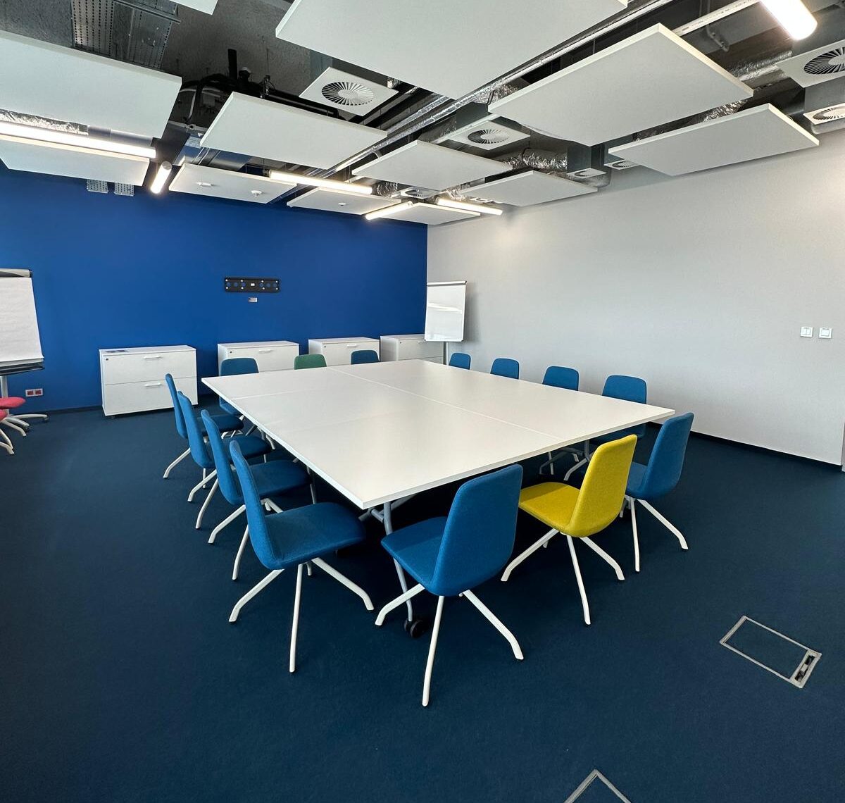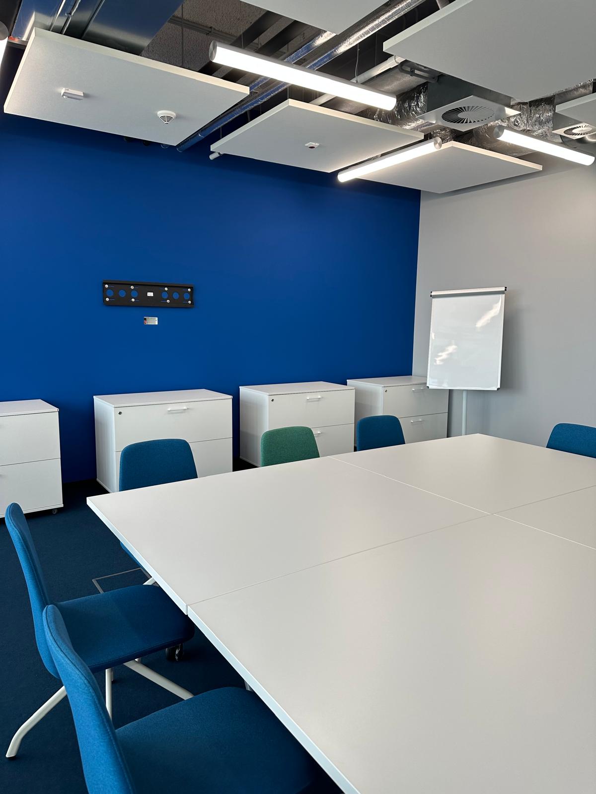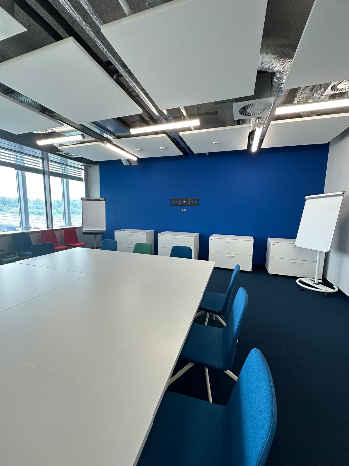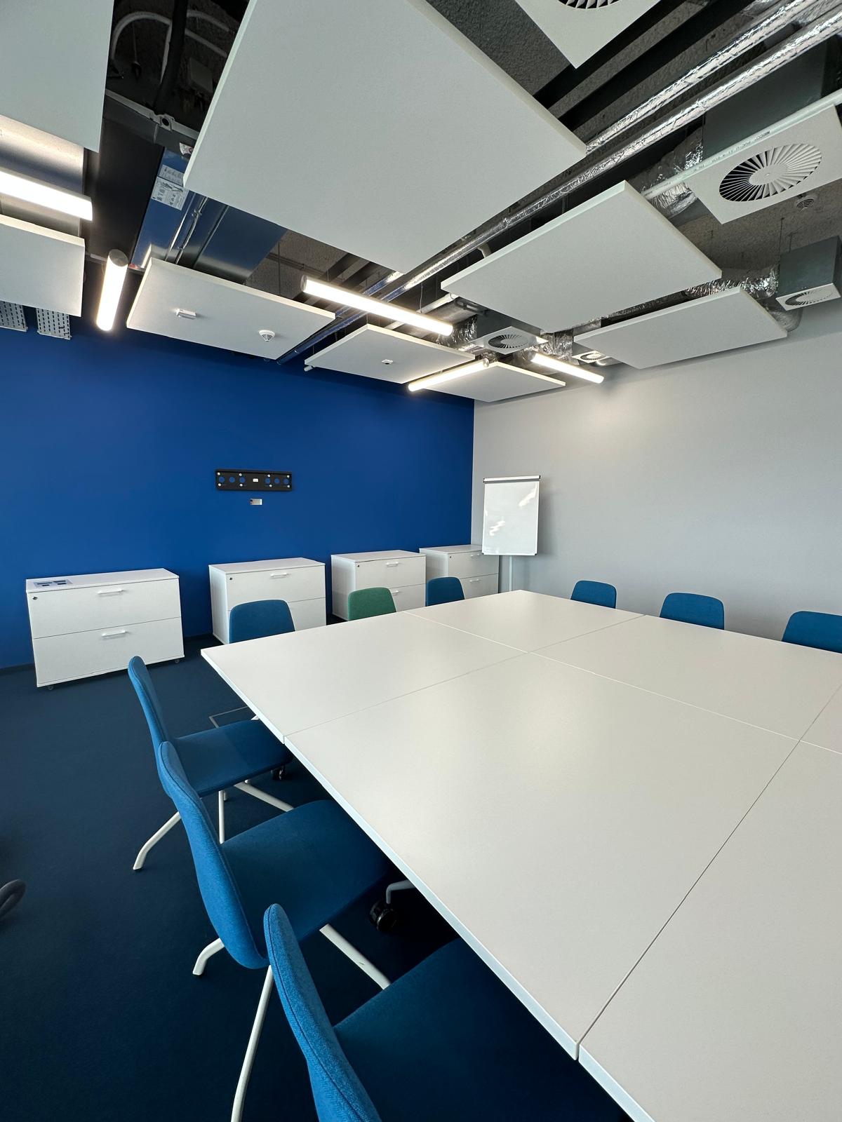 W trakcie prac zauważyliśmy, że cokoły przypodłogowe, wykonane przez poprzednią ekipę, nie spełniały standardów jakościowych. W ramach naszego partnerskiego podejścia, wykraczając poza ustalenia przetargowe, poświęciliśmy dodatkowy czas na ich naprawę. Nie mogliśmy pozwolić, by taki detal obniżył finalny efekt naszej pracy. Po zakończeniu wszystkich działań, sala konferencyjna została przez nas gruntownie wysprzątana. Na etapie odbioru klient z pełnym zadowoleniem potwierdził najwyższą jakość wykonanych prac, nie zgłaszając żadnych zastrzeżeń.